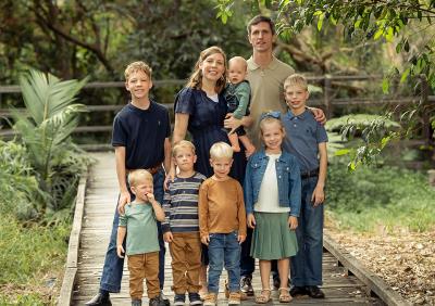 David and Naomi met at church but saw each other most often as they served on Mission Prayer Band council together. The Lord brought them together in marriage in 2010 and has since blessed them with seven children: Caleb, Ethan, Eliana, Titus, Hudson, Asher, and Ezra.